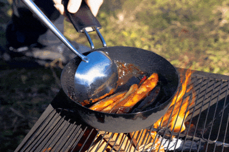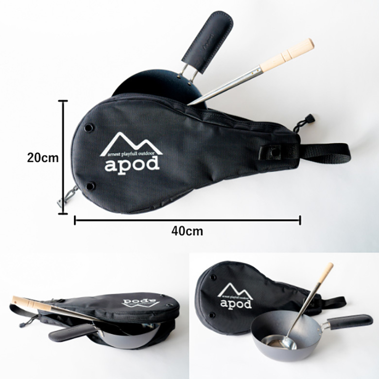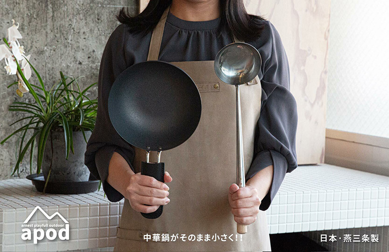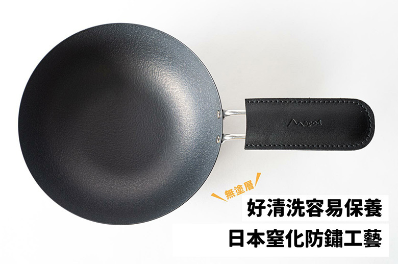 apod迷你炒鍋耐刮耐用,底部設計能平穩放在焚火台、柴火堆上。日本手工縫製真皮隔熱柄套,盡情在火堆上嘗試大火翻炒美味料理吧!!