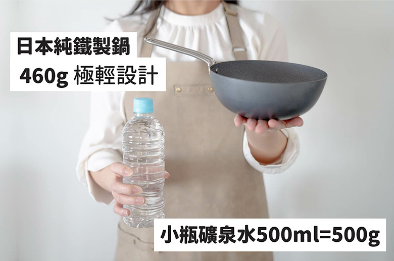 握把角度適合手腕握持,極致輕量輕鬆抬起晃動翻炒,長時間料理也毫無負擔。堅固耐用的純鐵炒鍋,比500ml的小瓶礦泉水還輕!
