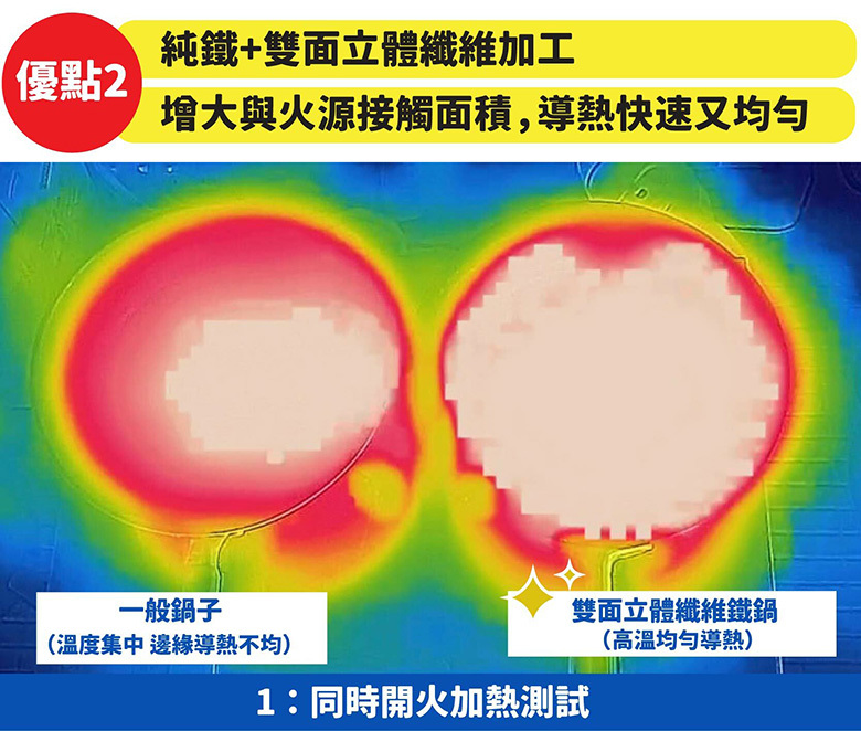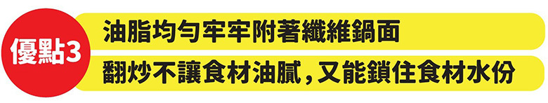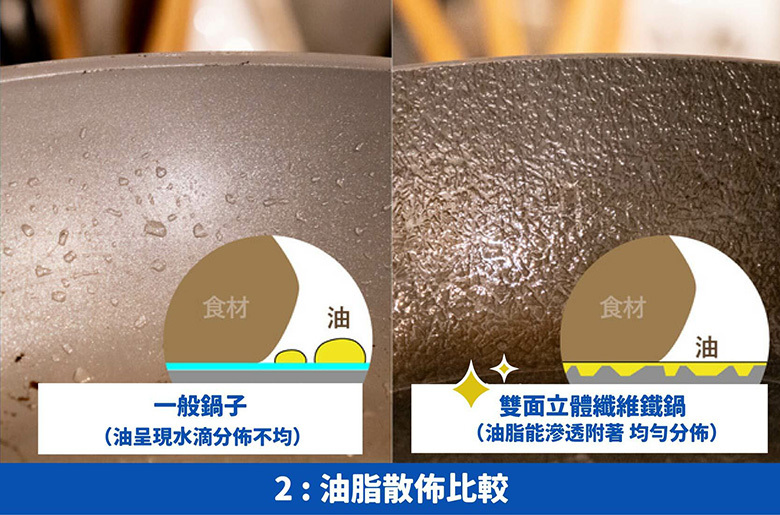 油脂在一般鍋子會分散成不均勻的顆粒狀,料理時容易過於油膩;雙纖維鐵鍋能以均勻的高溫一口氣煮熟食材,保留食材的鮮脆度,鎖住水份和營養。