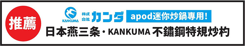 位於日本燕三條的株式会社カンダ,1965年以來專注為日本中華料理廚師生產高品質炊具。特別於合作推出「Kankuma不鏽鋼炒杓」。特別設計的角度和尺寸,讓你在拌炒翻動、擺盤上菜時,也能像大廚一樣華麗。