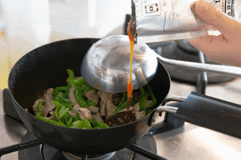 市售調醬料無需拌勻,直接用炒杓翻炒出香氣。由於鐵鍋很好的親油性,讓食材沾滿醬汁又不過油膩,鐵鍋大火高溫一口氣煮熟,鎖住食材本身的營養、水份和鮮脆度。