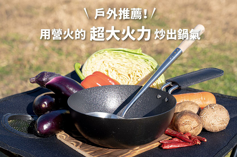 實現居家小廚房難以辦到的超大火力料理!雖是圓弧形小炒鍋,刻意在底部設計平整面,無論放在柴火堆、或焚火台都能平穩料理,不怕刮傷。
