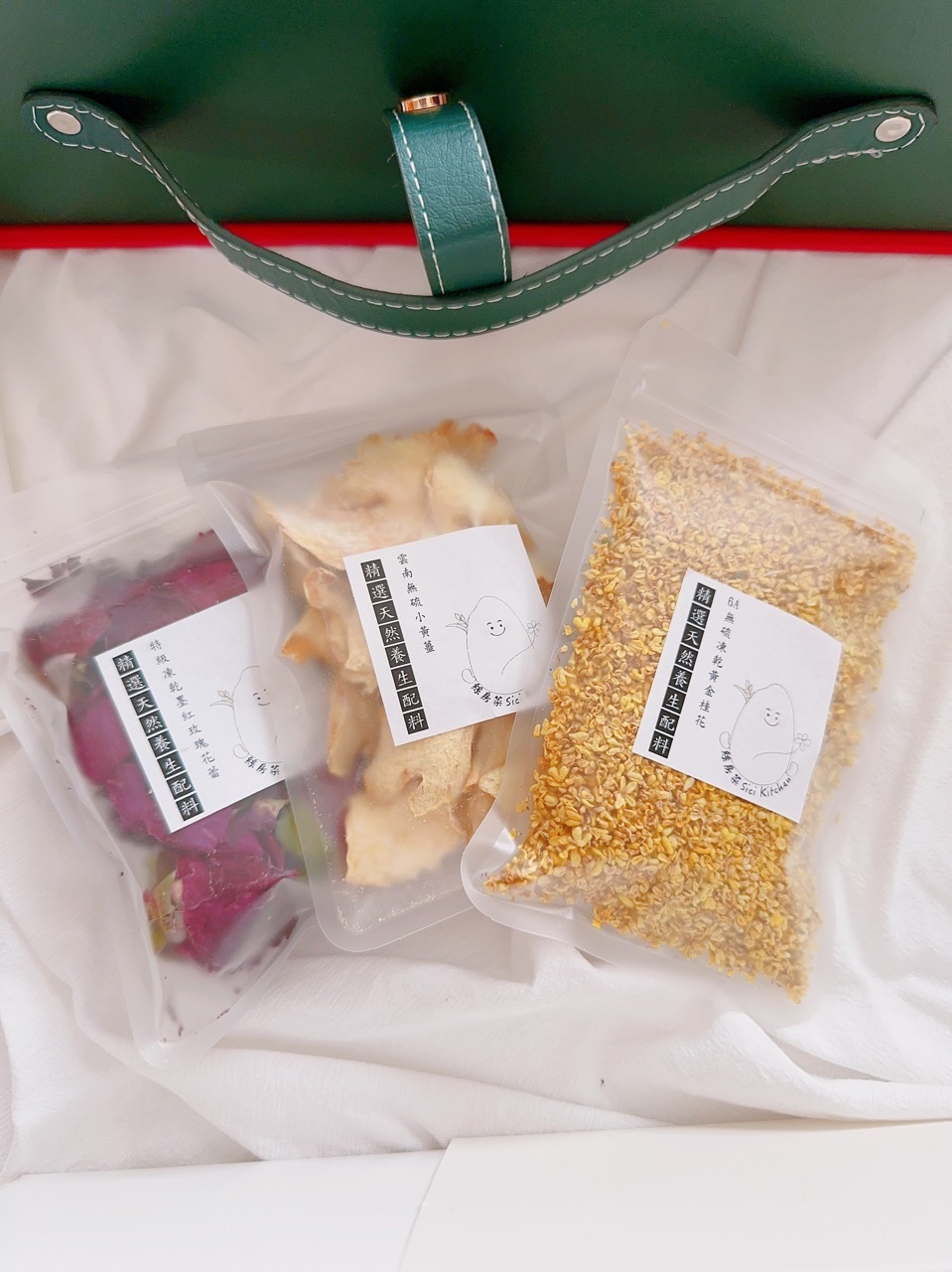 3. 可依喜好,加入養生配料: 桂花,小黃薑,凍乾墨紅玫瑰沖泡飲用。